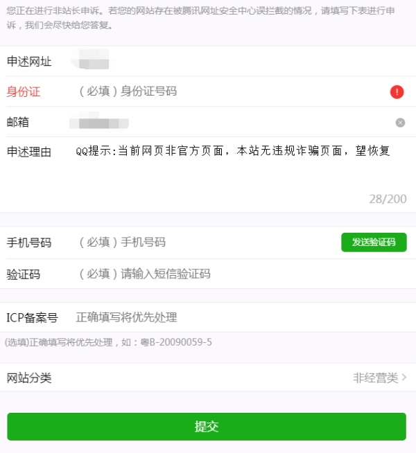 填寫好網(wǎng)址,身份證郵箱,手機(jī)驗(yàn)證,備案號(hào),選擇非經(jīng)營類。提交申述。